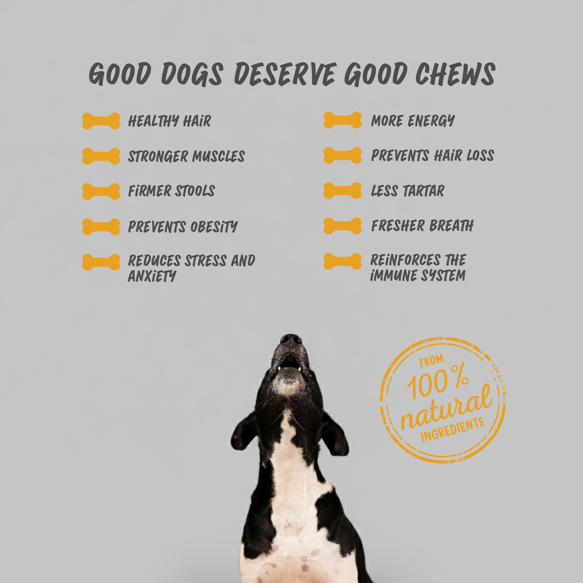 Dieser Dental-Kausnack aus 100 % natürlichem Casein wurde speziell entwickelt, um die Zahngesundheit deines Hundes nachhaltig zu unterstützen. Er ist laktose- und glutenfrei, besonders gut verträglich und ideal für die tägliche Zahnpflege.