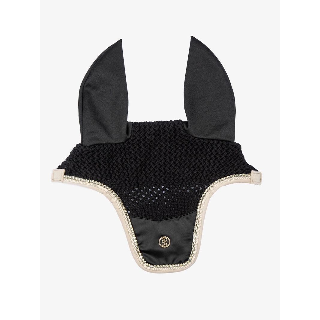 Anatomisch geformte Fliegenhaube mit elastischem Jersey an den Ohren und handgehäkeltem Einsatz vorne. Kristallborte und glänzende Kordel als Dekoration entlang der Kante, passend zur Vintage Monogramm-Kollektion.