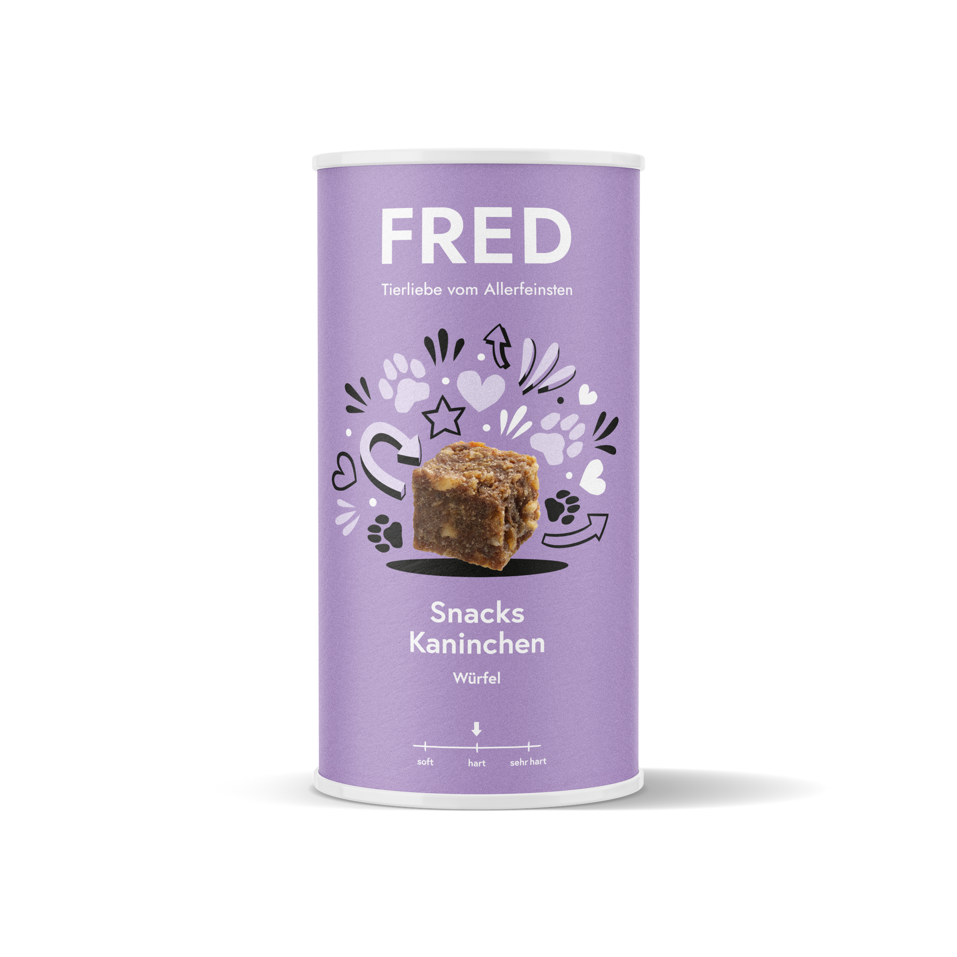 Fütterungsempfehlung: Frisches Kaninchenfleisch (92%), Erbsenmehl (6,5%), Flohsamenschalen (1%), Gemüsebrühe (0,5%)
