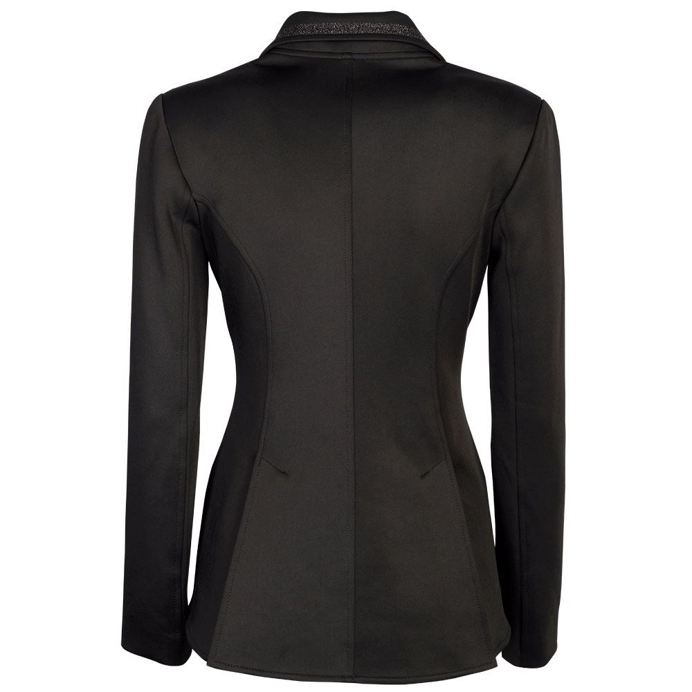 Für eine perfekte Passform ist das Jackett mit einem kristallenen Knopfverschluss ausgestattet, unter dem sich ein praktischer Reißverschluss verbirgt – für sicheren Halt und eine elegante Optik zugleich. Dezente Glitzerdetails am Kragen und an den Aufschlägen setzen stilvolle Akzente, ohne aufdringlich zu wirken.