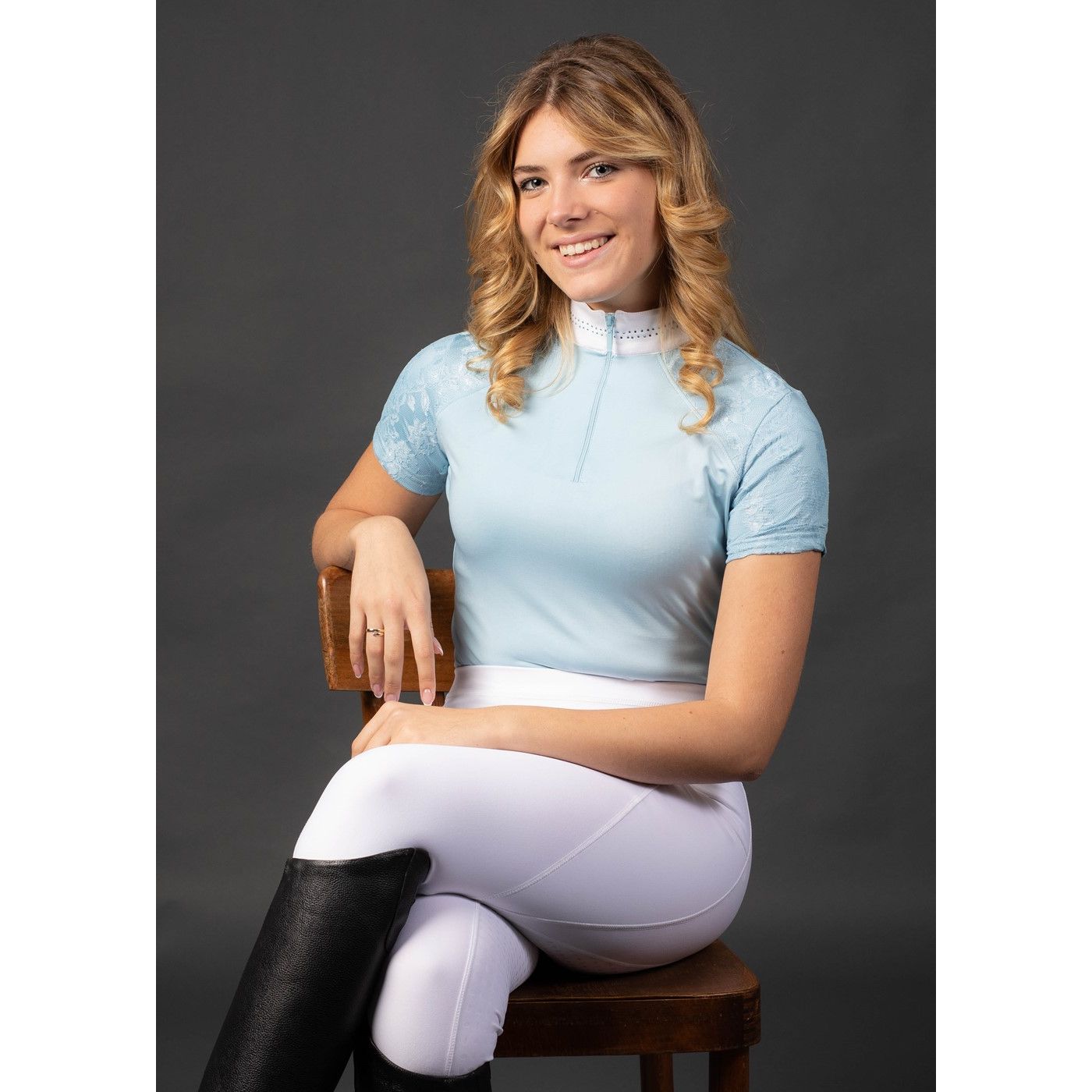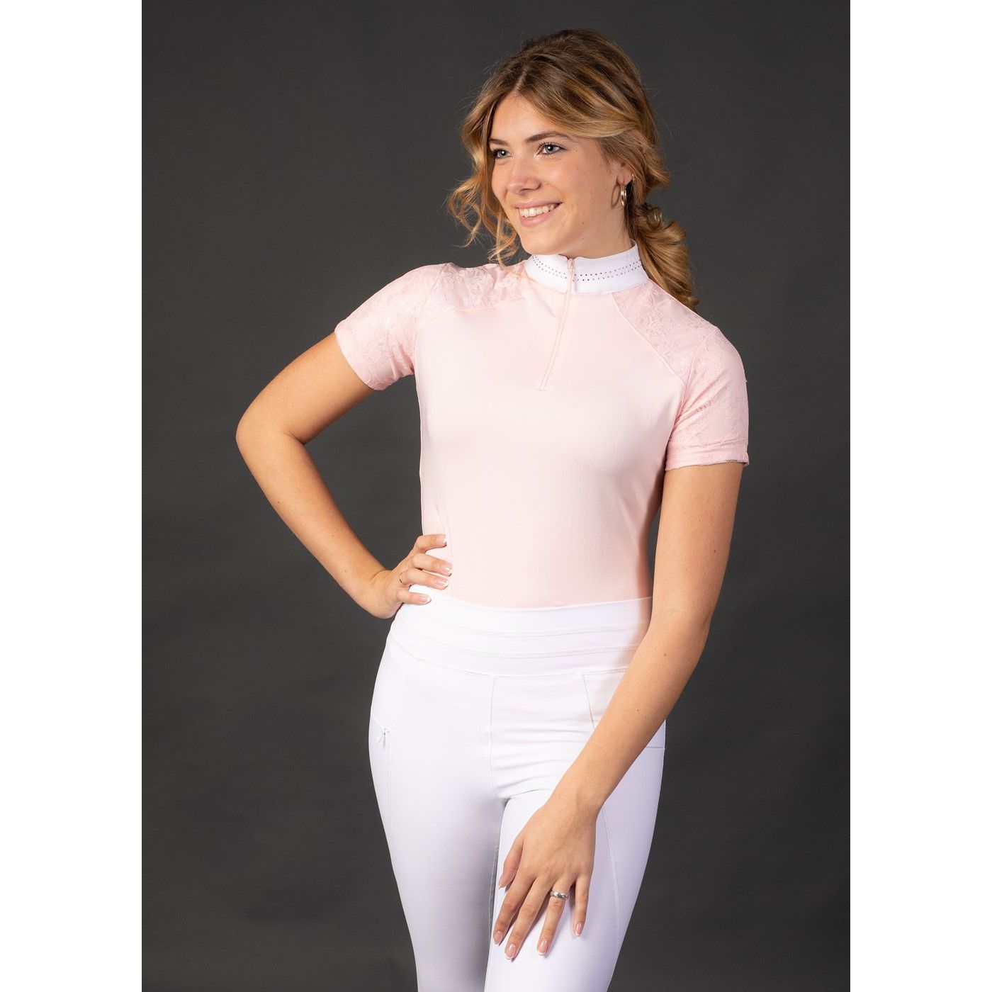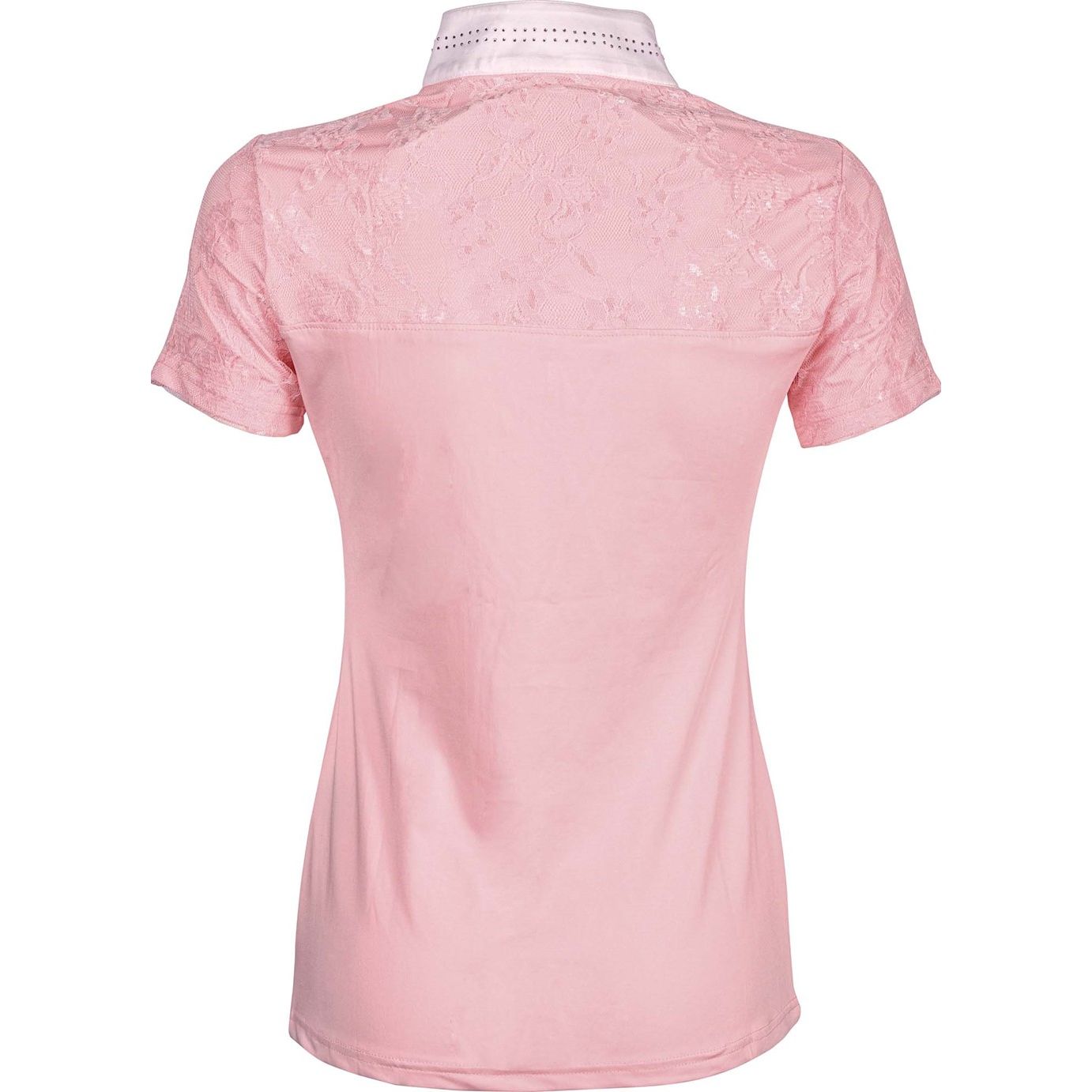 Turniershirt mit weißem Stehkragen mit kurzem Reißverschluss und farbigen Kristallen rundum, vorne und hinten teilweise mit Ton/Ton-Spitze gefüttert. 93% Micropolyester 7% Elastane
