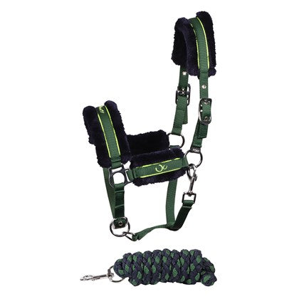 Halfterset mit weicher Kunstfellpolsterung und kontrastierenden Details. Das Genickstück ist beidseitig verstellbar, die Nasenriemen ebenfalls verstellbar. Inklusive Führstrick (Länge: 2 Meter).