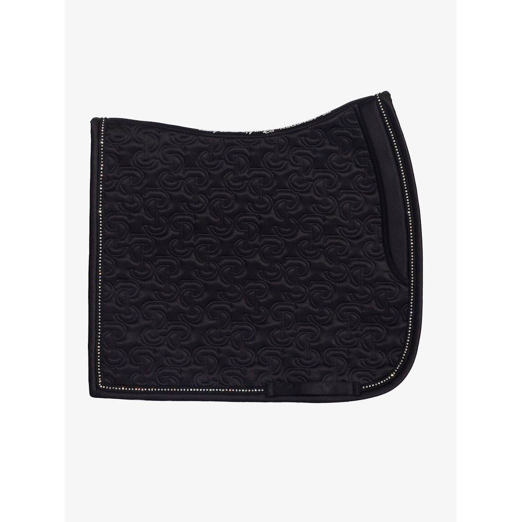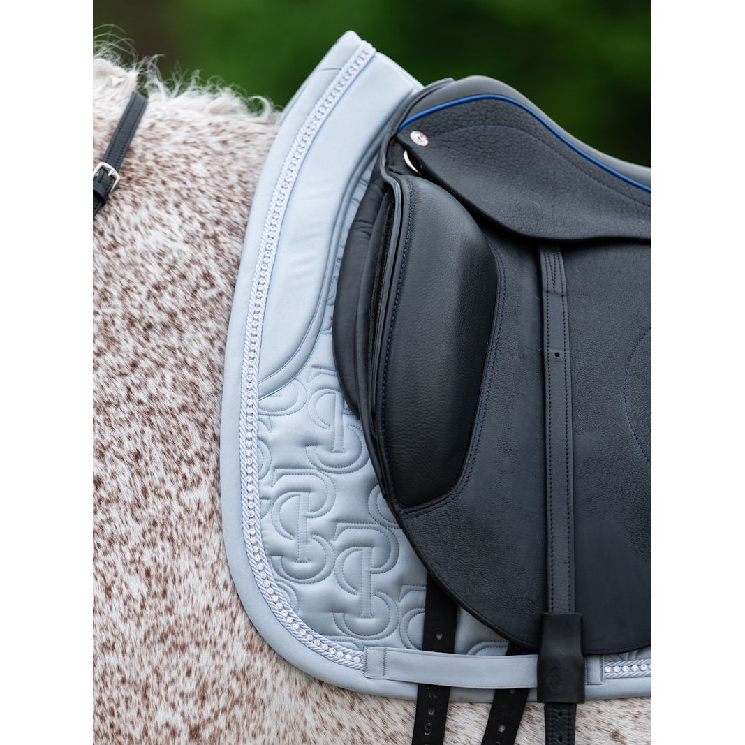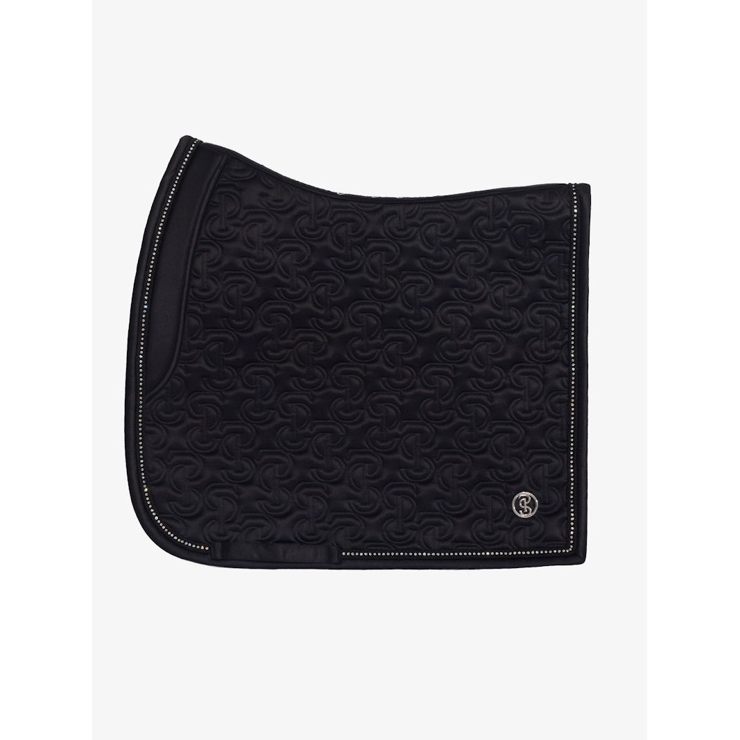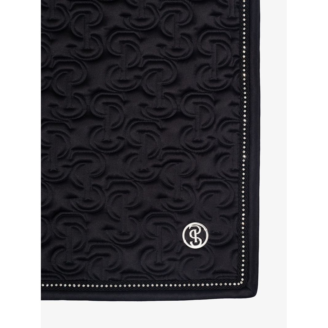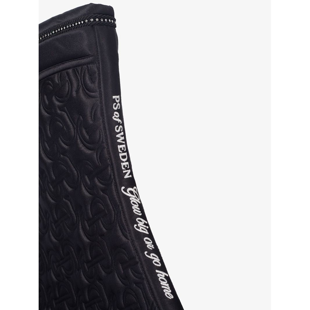Anatomische Schabracke aus hochwertigem, glänzendem Satinmaterial mit einzigartigem Steppmuster und PS-Logo, das mit Kristallen besetzt ist.