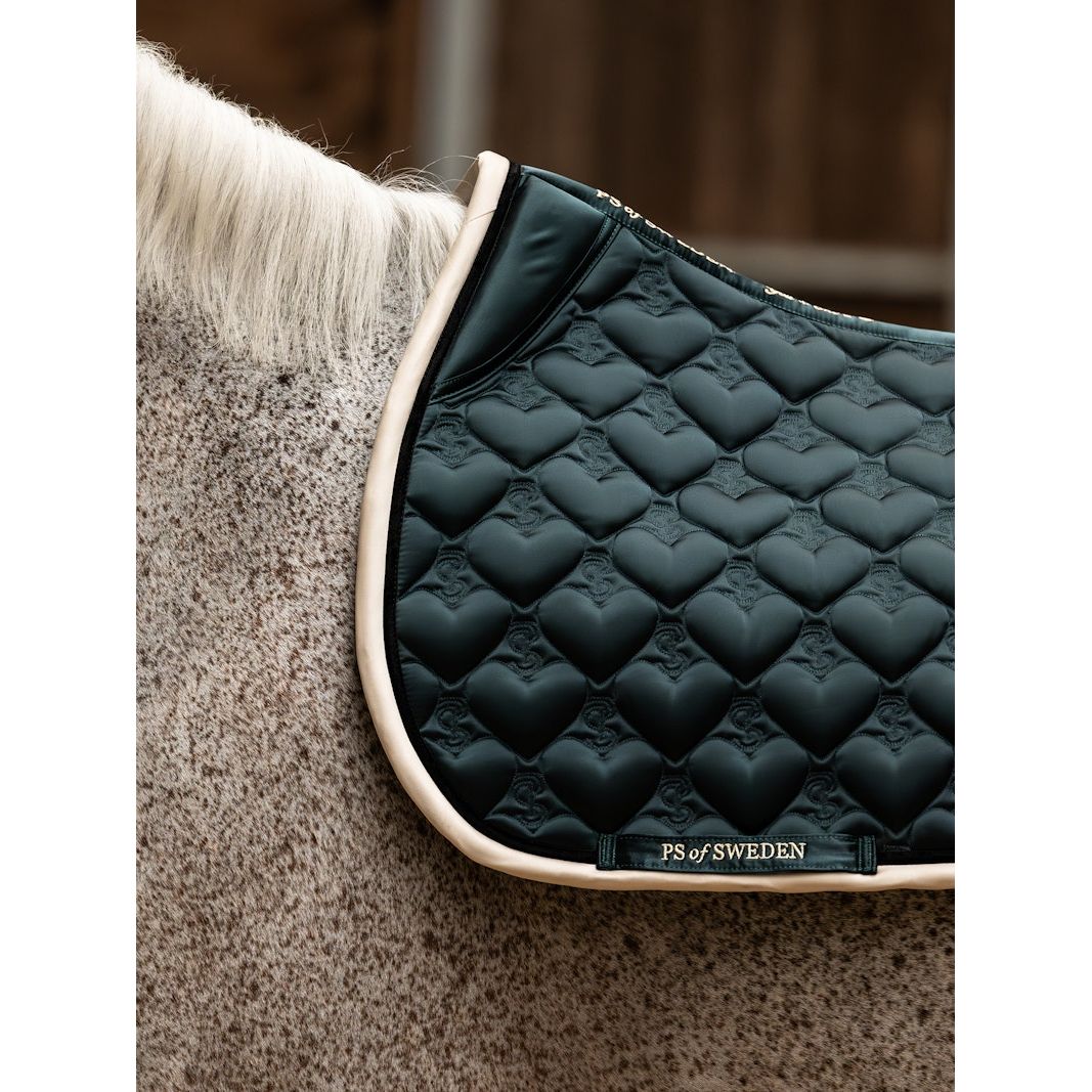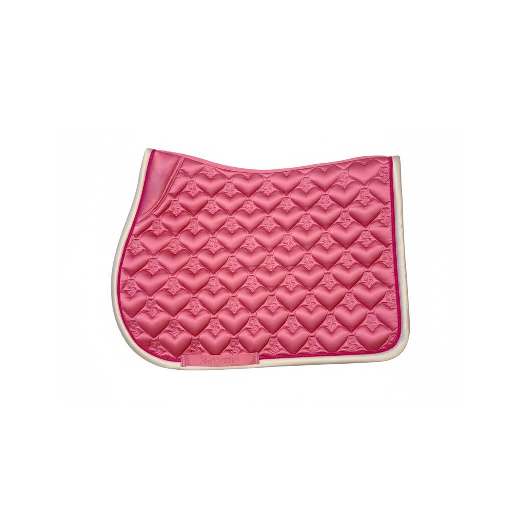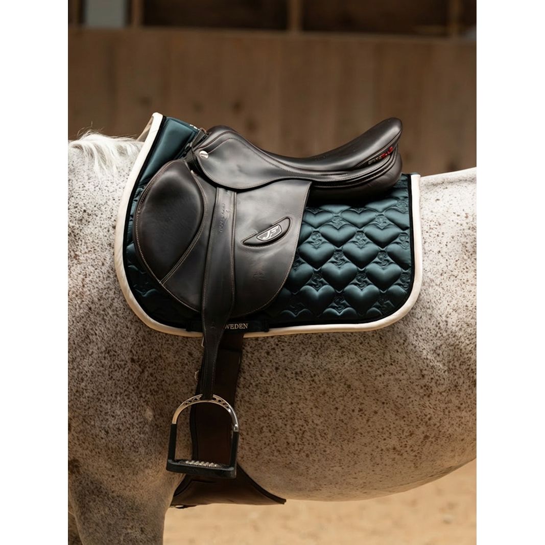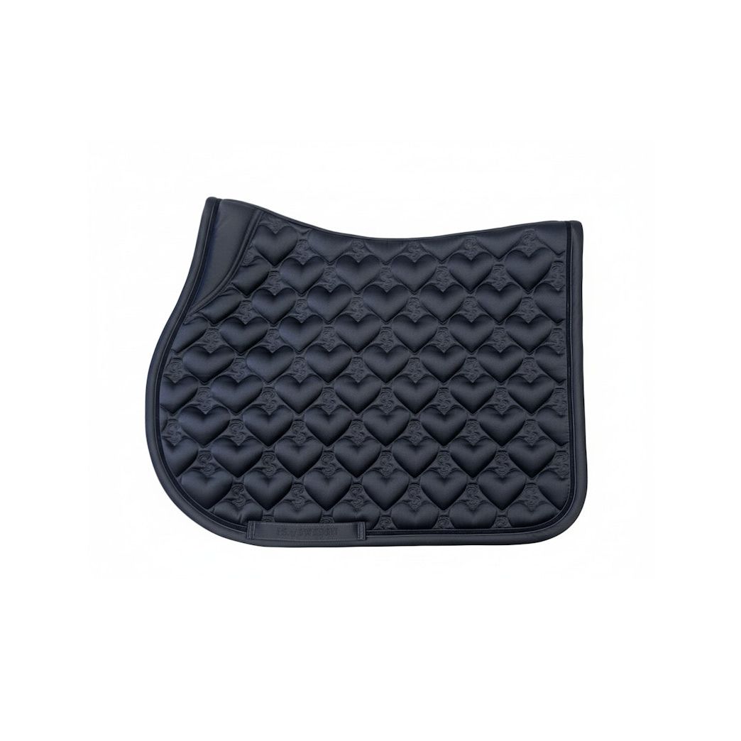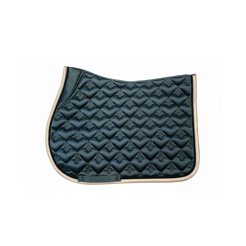 Anatomische Schabracke in limitierter Auflage mit auffälliger, wunderschöner herzförmiger Steppung. Sie verfügt über ein einzigartiges persönliches Liebeszitat entlang des Rückens und ein dekoratives Samtband entlang der Einfasung.