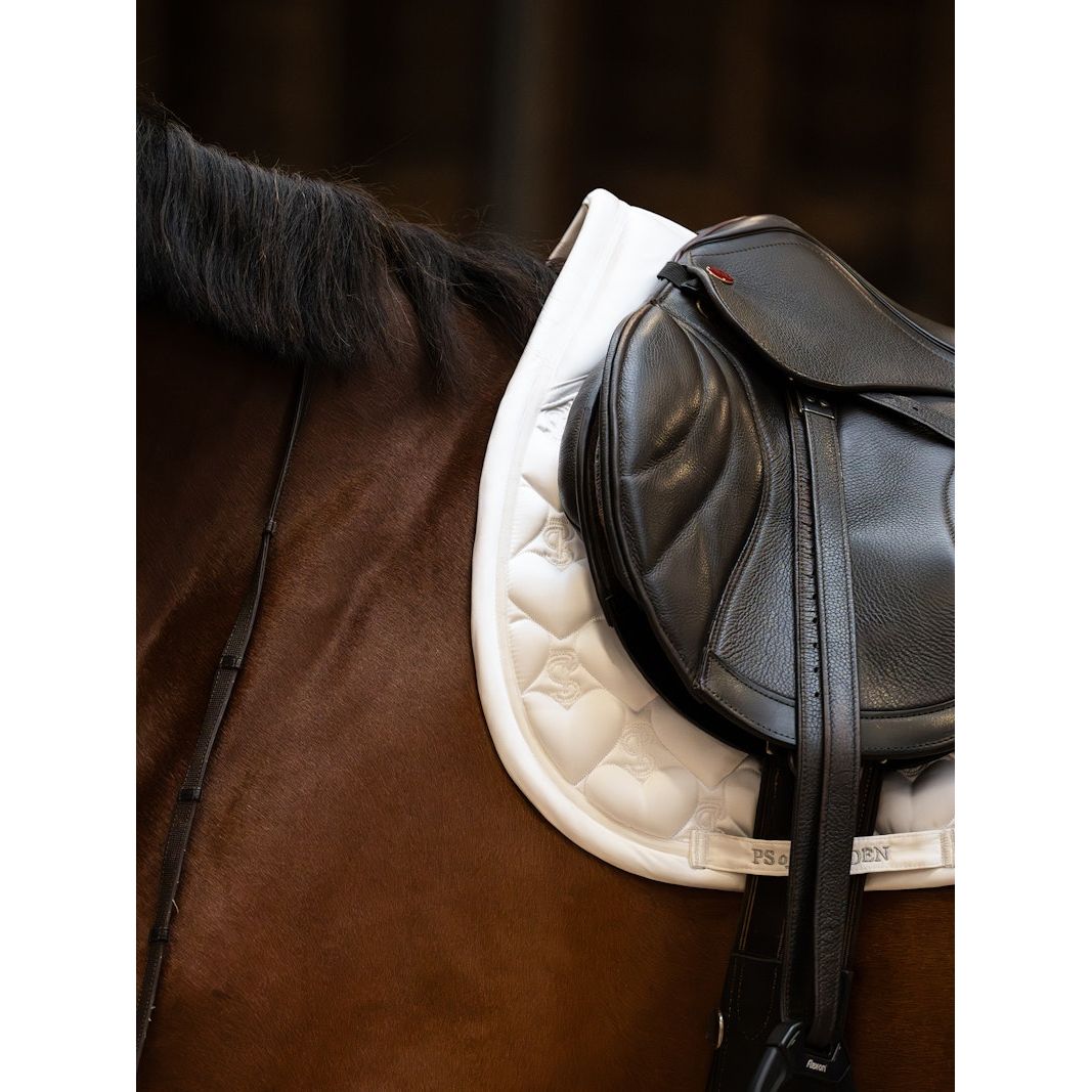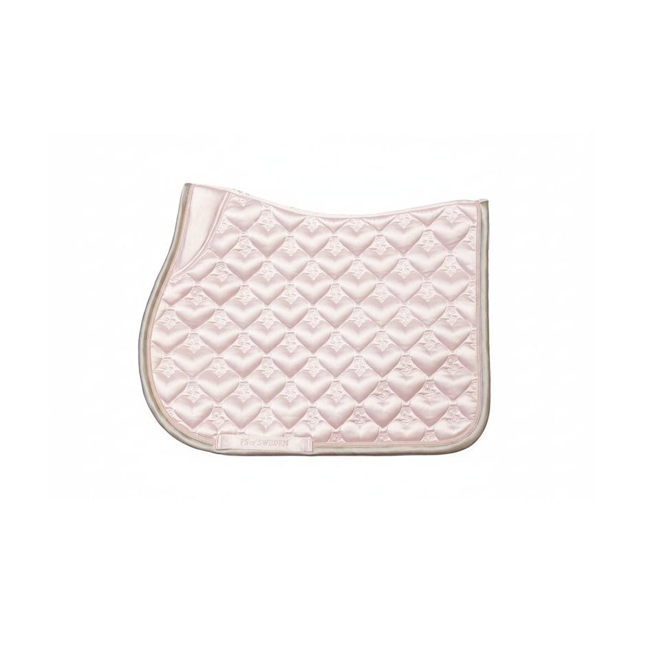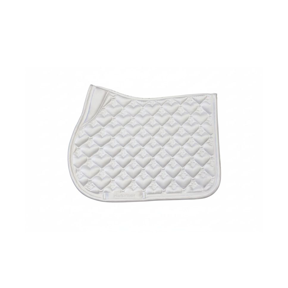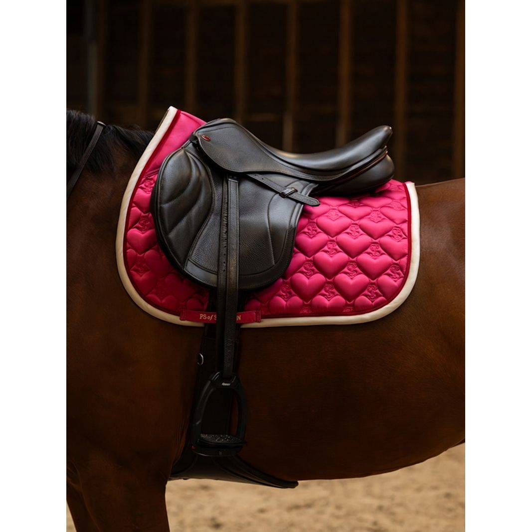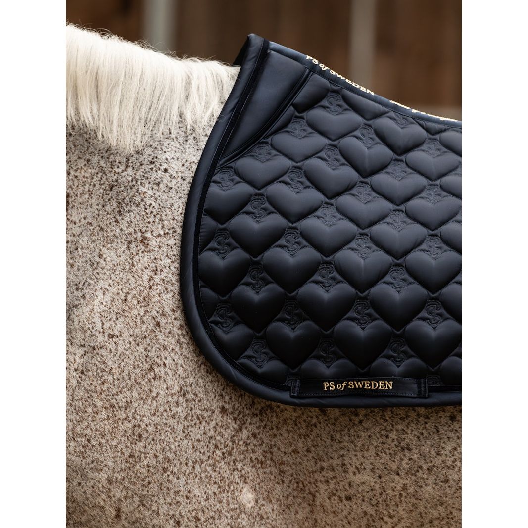 Anatomische Schabracke in limitierter Auflage mit auffälliger, wunderschöner herzförmiger Steppung. Sie verfügt über ein einzigartiges persönliches Liebeszitat entlang des Rückens und ein dekoratives Samtband entlang der Einfasung.