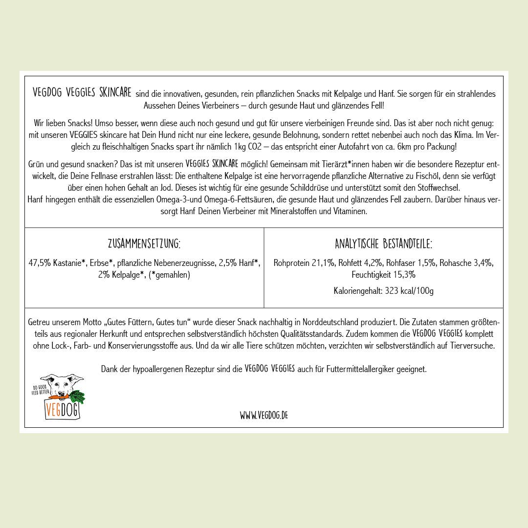 VEGDOG VEGGIES Skincare lässt Ihren Hund strahlen! Algen und Hanfsamen in diesen Snacks haben mehr als nur eine wahrnehmbare Wirkung auf die glatte Haut und das weiche Fell Ihres Haustiers.